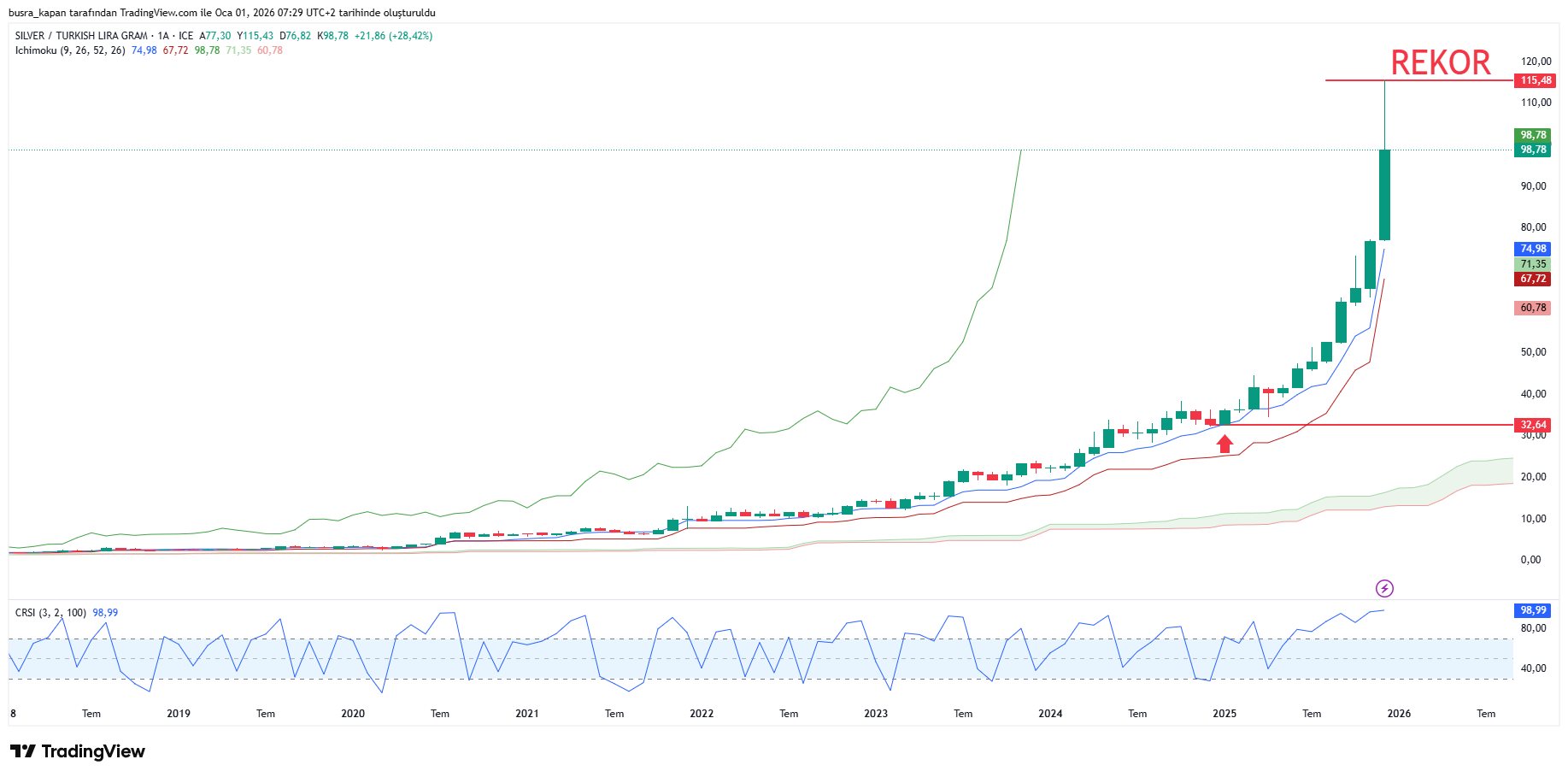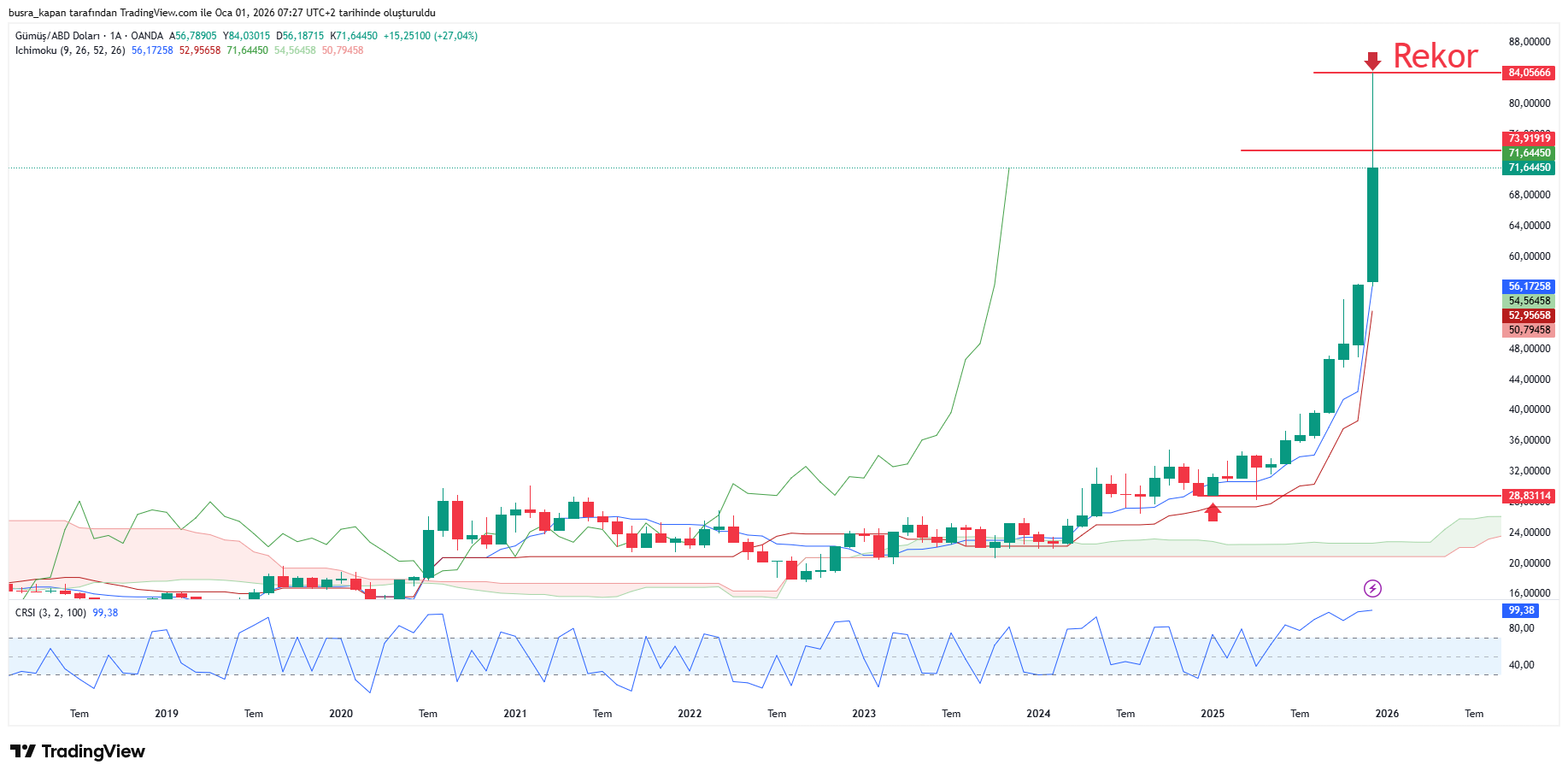 Ons gümüş, 28.73 dolardan başlayarak %192’nin üzerinde bir artışla 84.05 dolara ulaşarak rekor seviyelere çıktı.