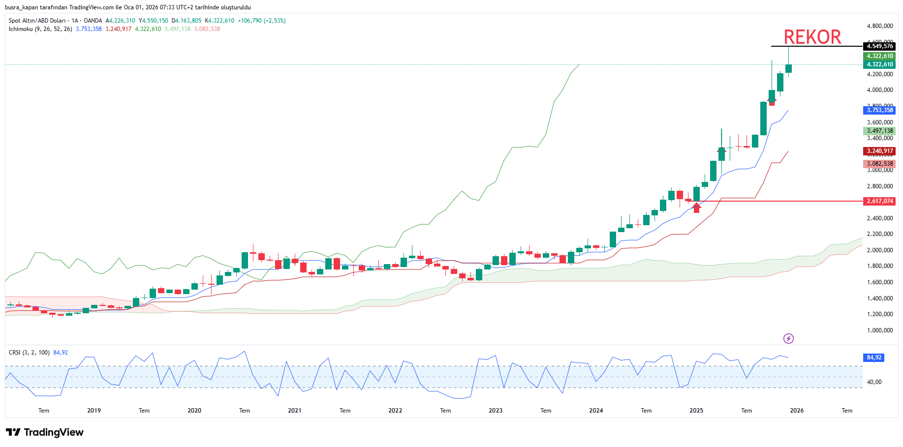 Altın fiyatları da 2025 yılında sert bir yükseliş gösterdi. Yılın başında 2,614 dolardan işlem gören ons altın, %72’nin üzerinde bir artışla 4,549 dolara yükseldi.