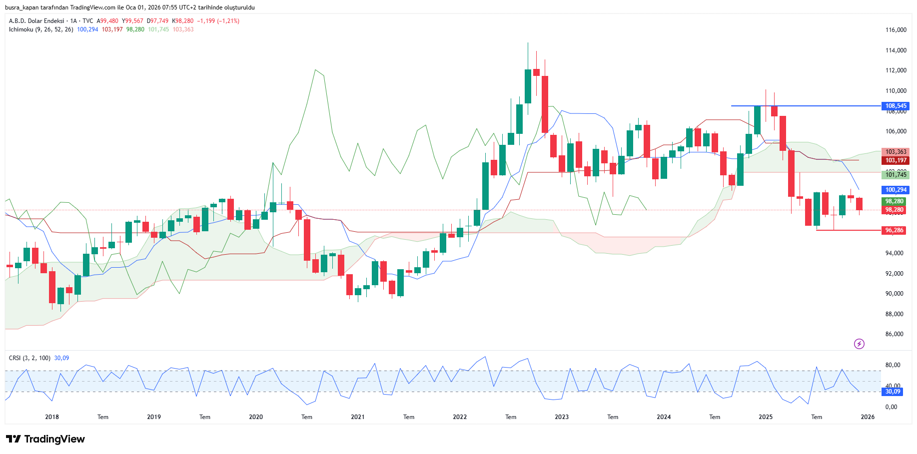 2025 yılında dolar endeksi, en çok değer kaybeden yatırım araçları arasında yer aldı. Yıl başında 108,45 puandan işlem gören dolar endeksi, %98,286 puana gerileyerek düşüş yaşadı.