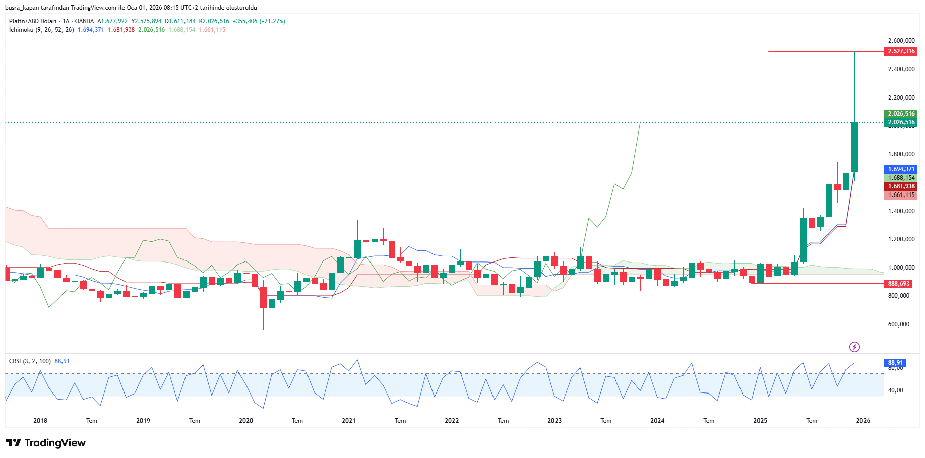 Değerli metallerden olan platin de yatırımcısına karlı bir yıl yaşattı. 2025 yılına 888 dolardan başlayan platin, 2,527 puana kadar yükselerek yeni rekorlar kırdı. Bank of America’nın platinin geleceğin yatırım aracı olacağı yönündeki görüşleri de bu yöndeki beklentileri artırdı.