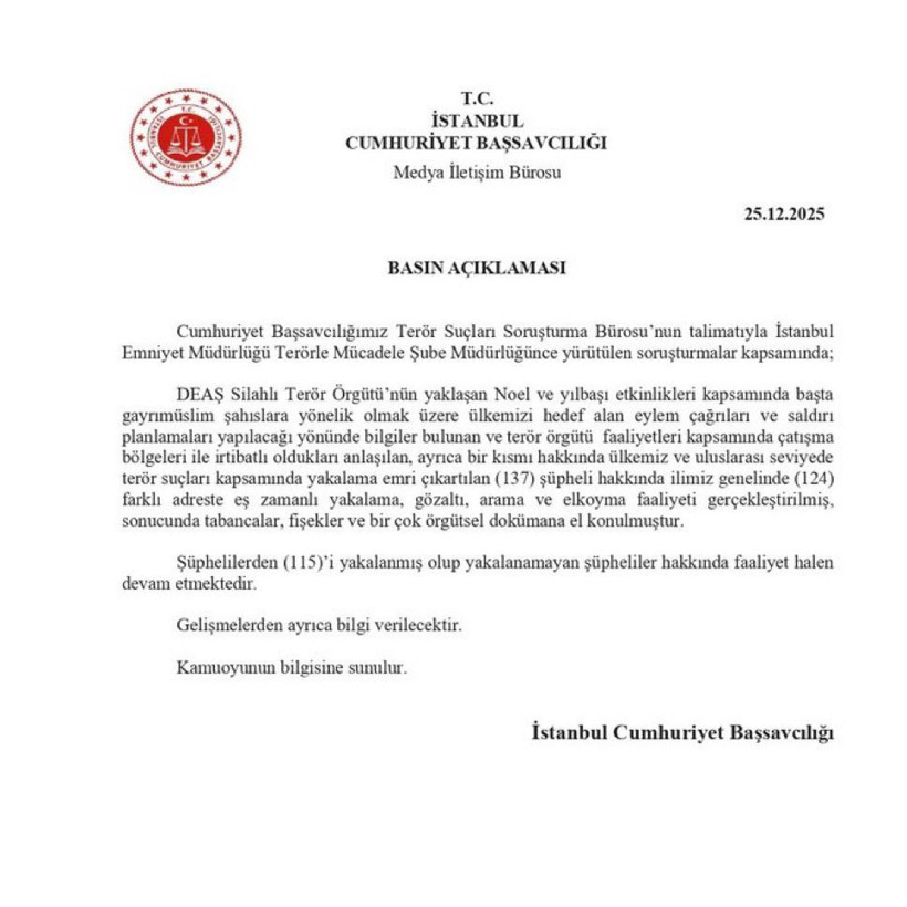 İstanbul İl Emniyet Müdürlüğü ekipleri, yılbaşında eylem yapmaya hazırlanan terör örgütü IŞİD’e operasyon düzenledi.