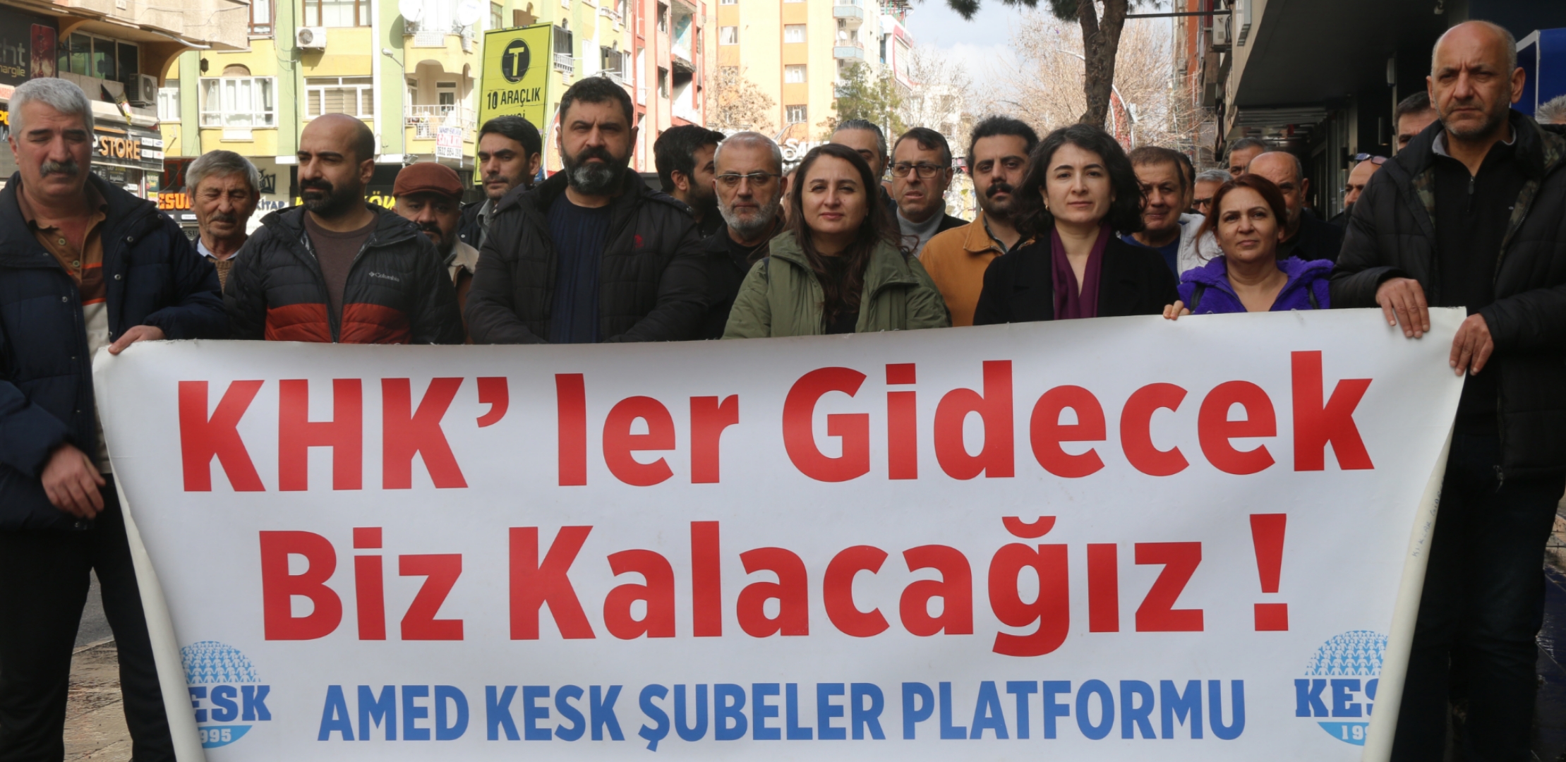 Kamu Emekçileri Sendikası Konfederasyonu (KESK) Amed Şubeler Platformu, Kanun Hükmünde Kararnameler (KHK) ile işten çıkarılanların iadesi talebiyle yaptıkları eylemi 156’ncı haftada da sürdürdü. Yenişehir ilçesi Ofis Semti AZC Plaza önünde gerçekleşen eylemde “KHK’ler gidecek biz kalacağız” pankartı açıldı. Türkiye Haberleşme, Kağıt ve Basın-Yayın Hizmet Kolu Kamu Çalışanları Sendikası (HABER-SEN) Amed Şube Eşbaşkanı Mehmet Ulug, 1 Eylül 2016’da yayımlanan KHK’lerle 4 bin 259 KESK üyesinin ihraç edildiğini hatırlattı. 2016’daki OHAL sürecinde çıkarılan KHK’ler ve 35’inci madde gerekçeyle yapılan ihraçlara karşı 156 haftadır mücadele ettiklerini belirten Ulug, ihraçların haksız ve hukuksuz olduğunu vurguladı. “İhraç edilen son arkadaşımız görevine iade edilene kadar mücadelemize devam edeceğiz” diyen Ulug, “KHK’ler gidecek biz kalacağız” sloganlarıyla açıklamayı sonlandırdı.