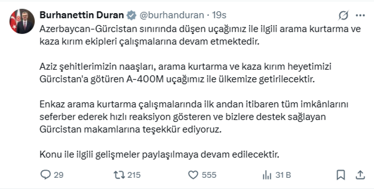 İletişim Başkanı Burhanettin Duran, Azerbaycan-Gürcistan sınırında düşen uçağımızdaki şehitlerin naaşlarının Türkiye’ye getirileceğini açıkladı. Duran, şehitlerin taşınması için Türkiye’nin A-400M nakliye uçağının görevlendirildiğini belirtti.